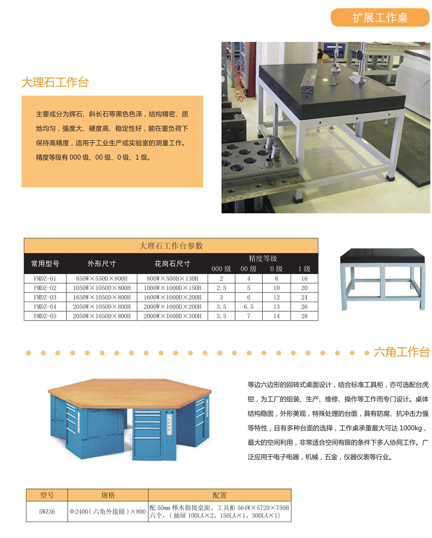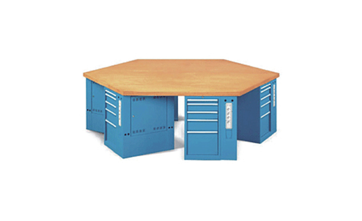 等边六边形的回转式桌面设计,结合标准工具柜,亦可选配台虎钳,为工厂的组装、生产、维修、操作等工作而专门设计。桌体结构稳固,外形美观,特殊处理的台面,具有防腐、抗冲击力强等特性,且有多种台面的选择,工作桌承重最大可达1000kg,