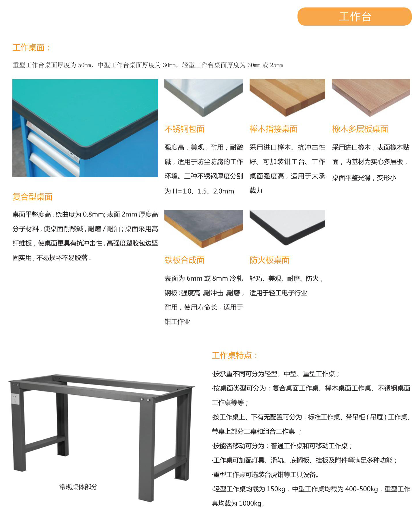 按桌面类型可分为:复合桌面工作桌、榉木桌面工作桌、不锈钢桌面工作桌等等;