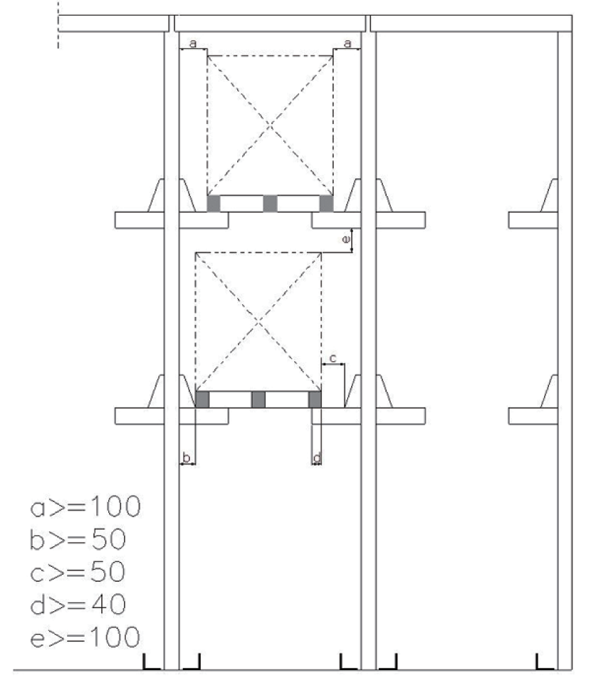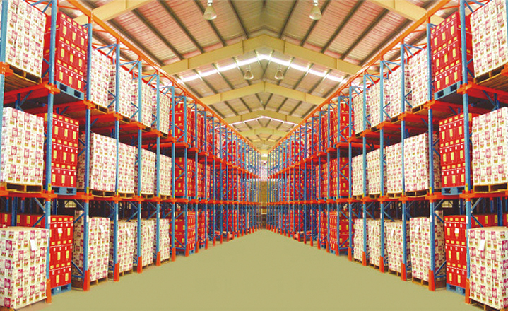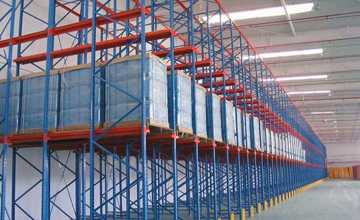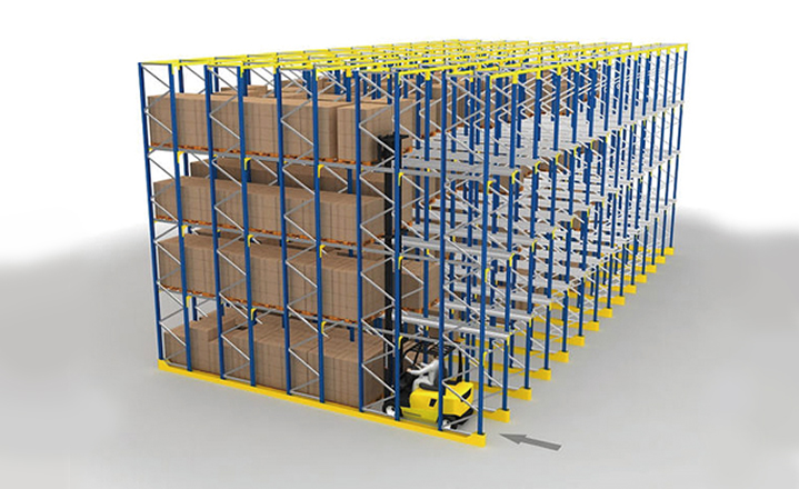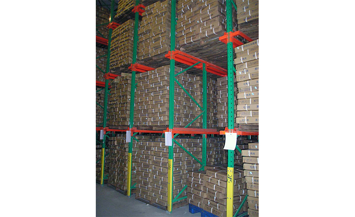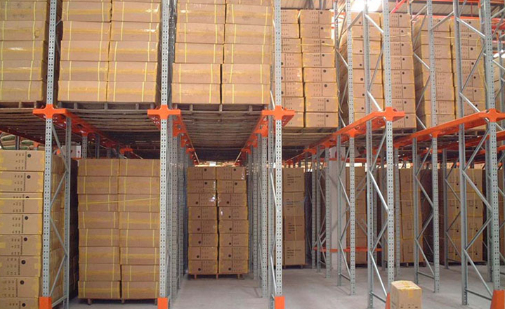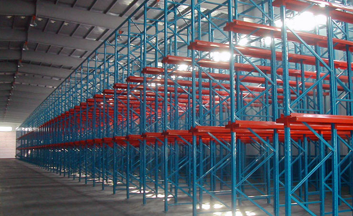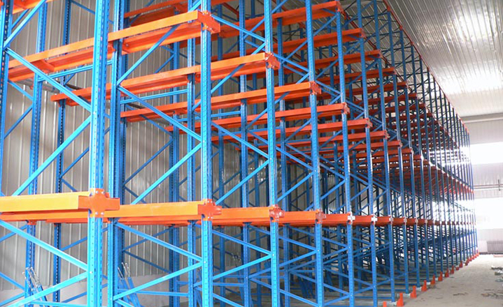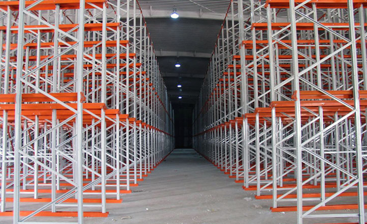 驶入式货架又称通廊式货架或驶入式货架,全插接组装式结构,柱片为装配式结构,牛腿为专用一次性冲压十字型牛腿,强度高刚性好,外形美观,牛腿梁为专轧斜坡式肋筋型超强牛腿梁,顶梁与柱片间为螺栓连接式结构;靠墙区域的货架总深度一般最好控制在9个托盘深度以内,中间区域可两边进出的货架总深度一般最好控制在15个托盘深度以内,以提高叉车存取的效率和可靠性。此种货架系统的稳定性是所有种类货架中较为薄弱的,为此货架不宜过高,一般在11m以内,另外系统中还需加设拉固装置。此种系统货架排布密集,空间利用率极高,几乎是常规托盘式货架的两倍,适于储存少品种大排量同类型货物,货物可从同一侧存入取出(先进后出),也可从一侧存入另一侧取出(先进先出),多用于乳业、饮料等食品行业,冷库中也较为多见。